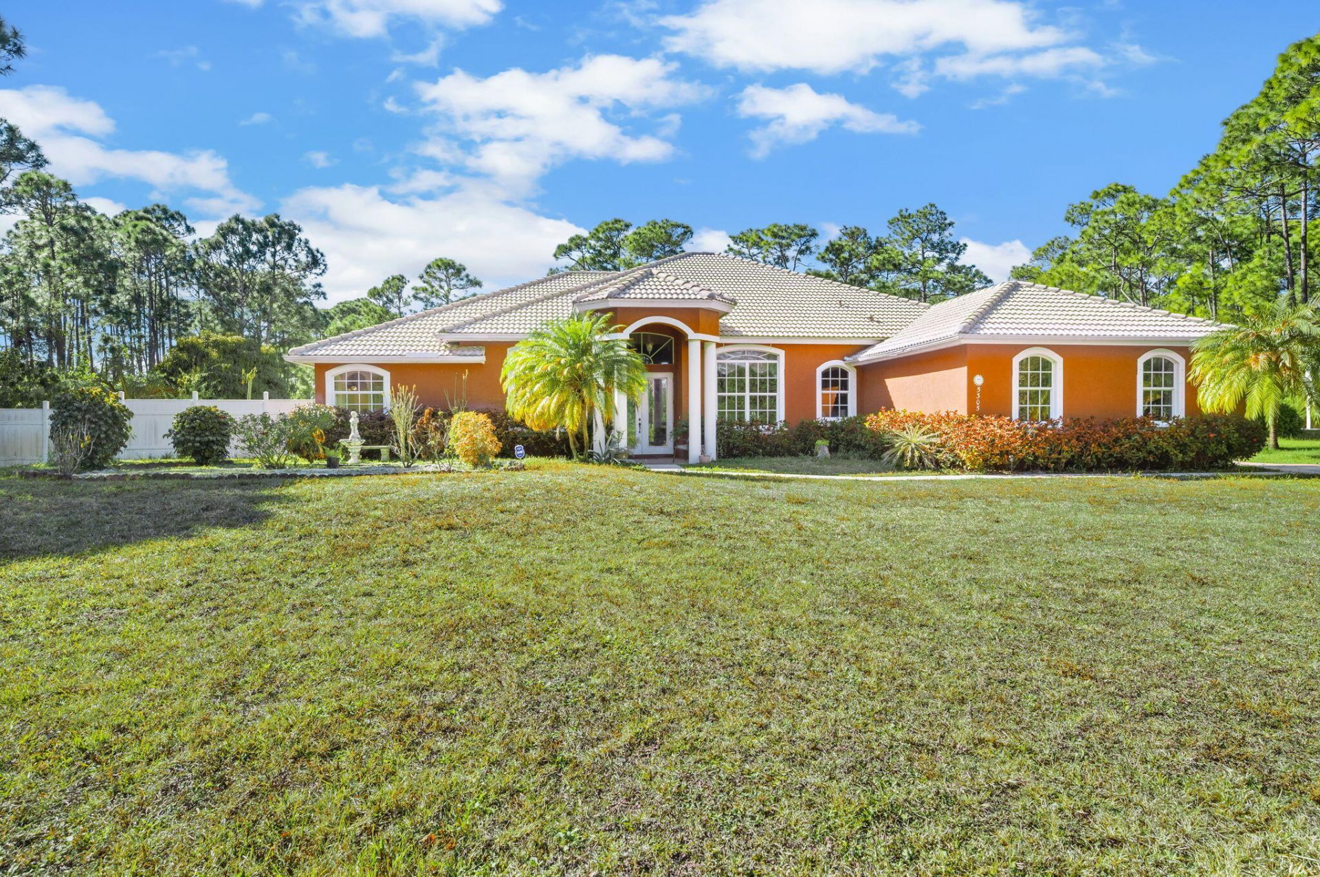 Private setting down a long dirt road on 1.15 acres. Property includes 10 mango trees, 6 coconut trees and an avocado tree. Screen enclosure on pool replaced 1 year ago. 3 car attached garage. Large family room open to spacious kitchen. Formal dining and living room with French doors to pool patio. Large primary bedroom with bidet, shower, separate tub, 2 closets, dual sinks and plenty of room for sitting area. 3 additional bedrooms and 2 full baths along with office or den or 5th bedroom. Insi...Private setting down a long dirt road on 1.15 acres. Property includes 10 mango trees, 6 coconut trees and an avocado tree. Screen enclosure on pool replaced 1 year ago. 3 car attached garage. Large family room open to spacious kitchen. Formal dining and living room with French doors to pool patio. Large primary bedroom with bidet, shower, separate tub, 2 closets, dual sinks and plenty of room for sitting area. 3 additional bedrooms and 2 full baths along with office or den or 5th bedroom. Inside laundry room. Plenty of room for RV and boat parking. This zoning often allows for horses and other agricultural uses.